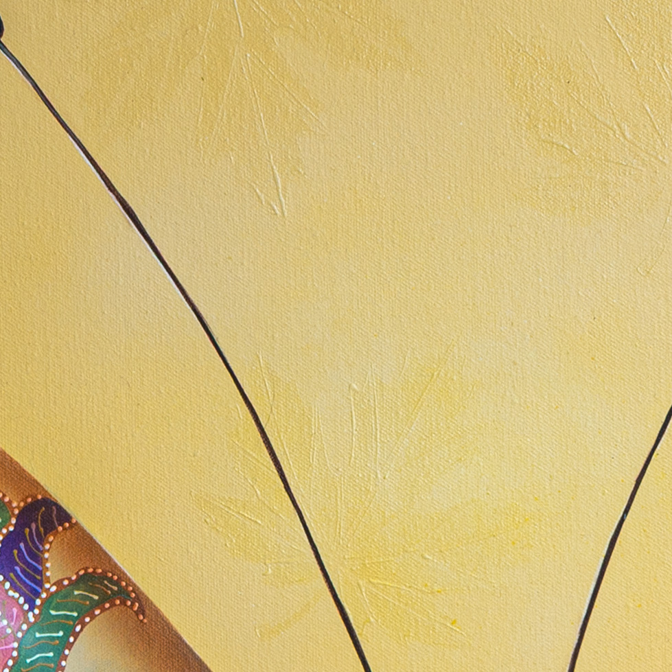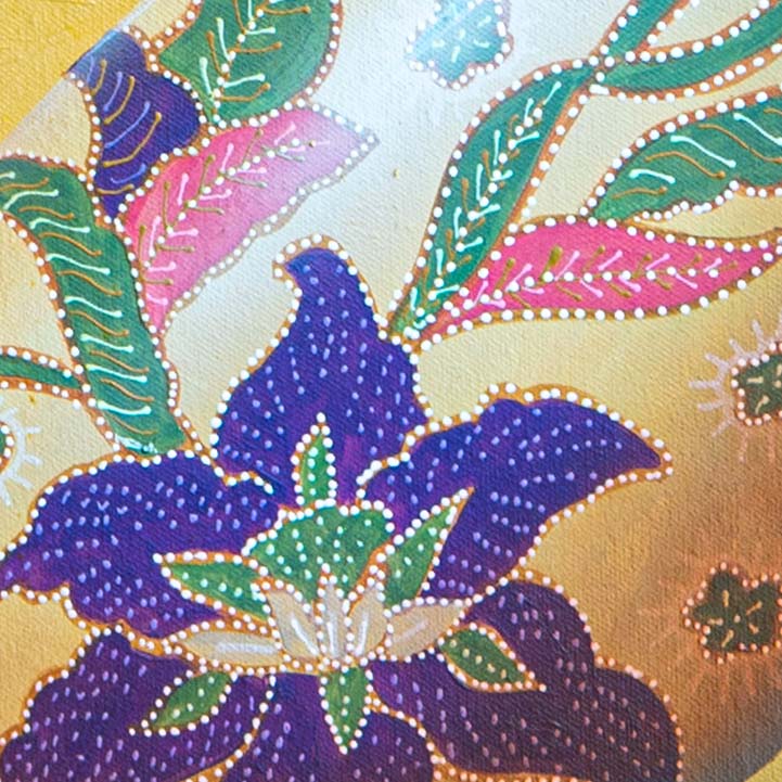 Her wings are dyed yellow, etched with batik patterns native to this land—part memory, part voice.